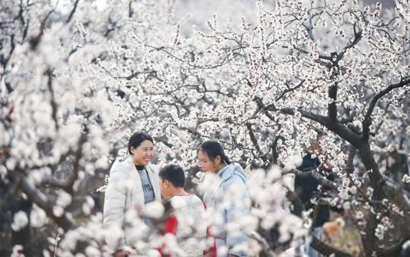 2026年3月8日,游客在河南省洛阳市涧西区瀛洲街道辖区内的千亩特色杏种植基地赏景游玩。(中新社)