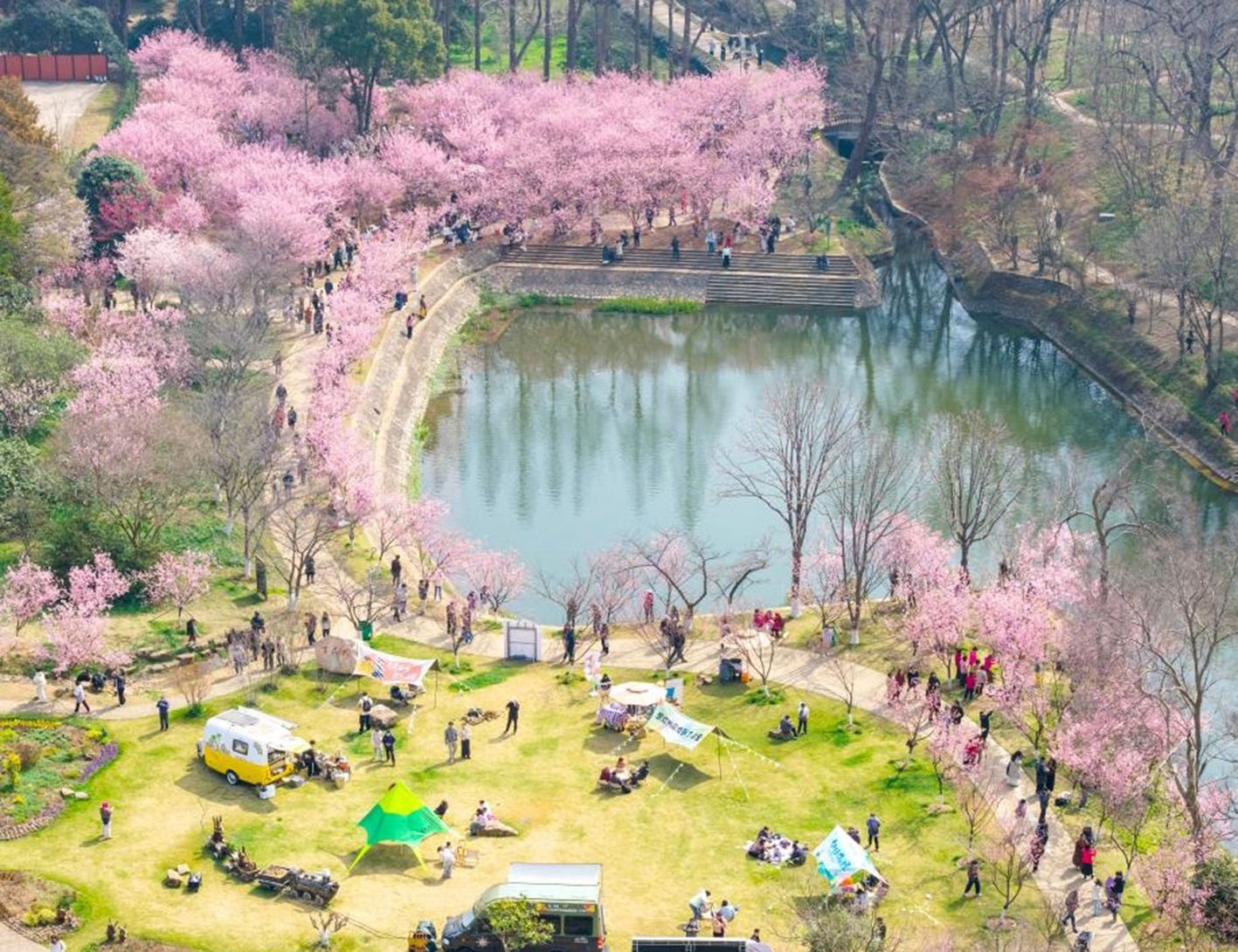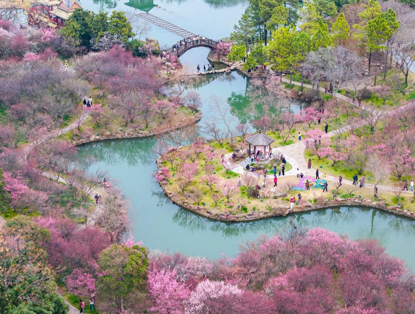 3月7日,游客在南京中山植物园赏樱游玩(无人机照片)。(新华社)