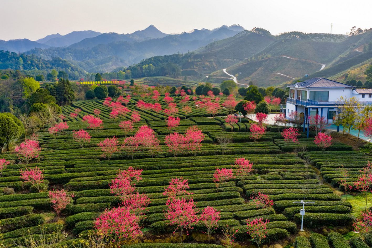 2026年3月7日,位于广西贺州市昭平县走马镇西坪村的粤桂协作西坪有机茶产业示范基地里,整齐连片的茶园与盛开的桃花互相映衬,构成一幅春日画卷。(人民网)