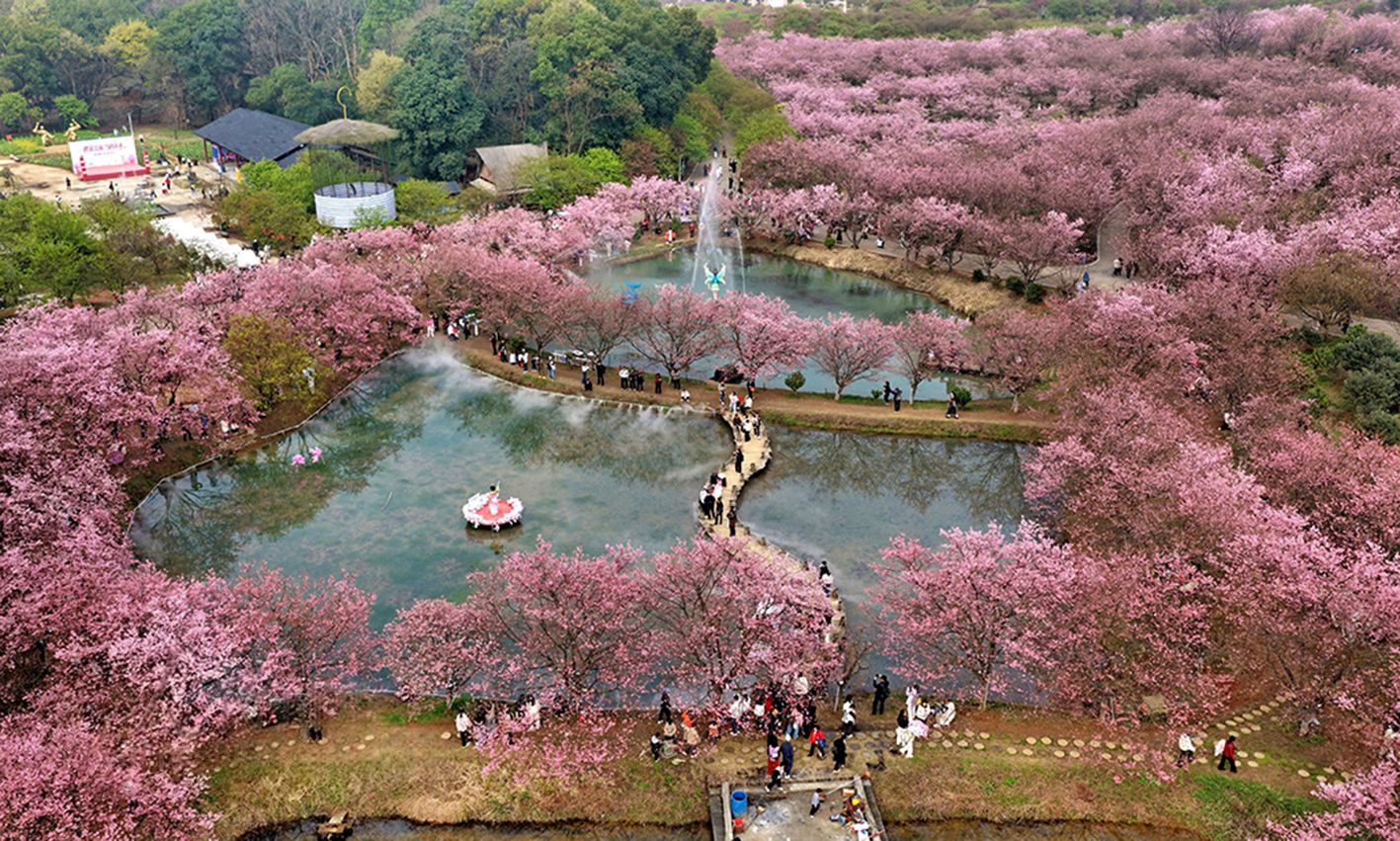 2026年3月7日,湖南省常宁市罗桥百万樱花园,景区千余亩樱花竞相绽放,吸引众多游客前来游玩,乐享春天美好时光。(人民网)