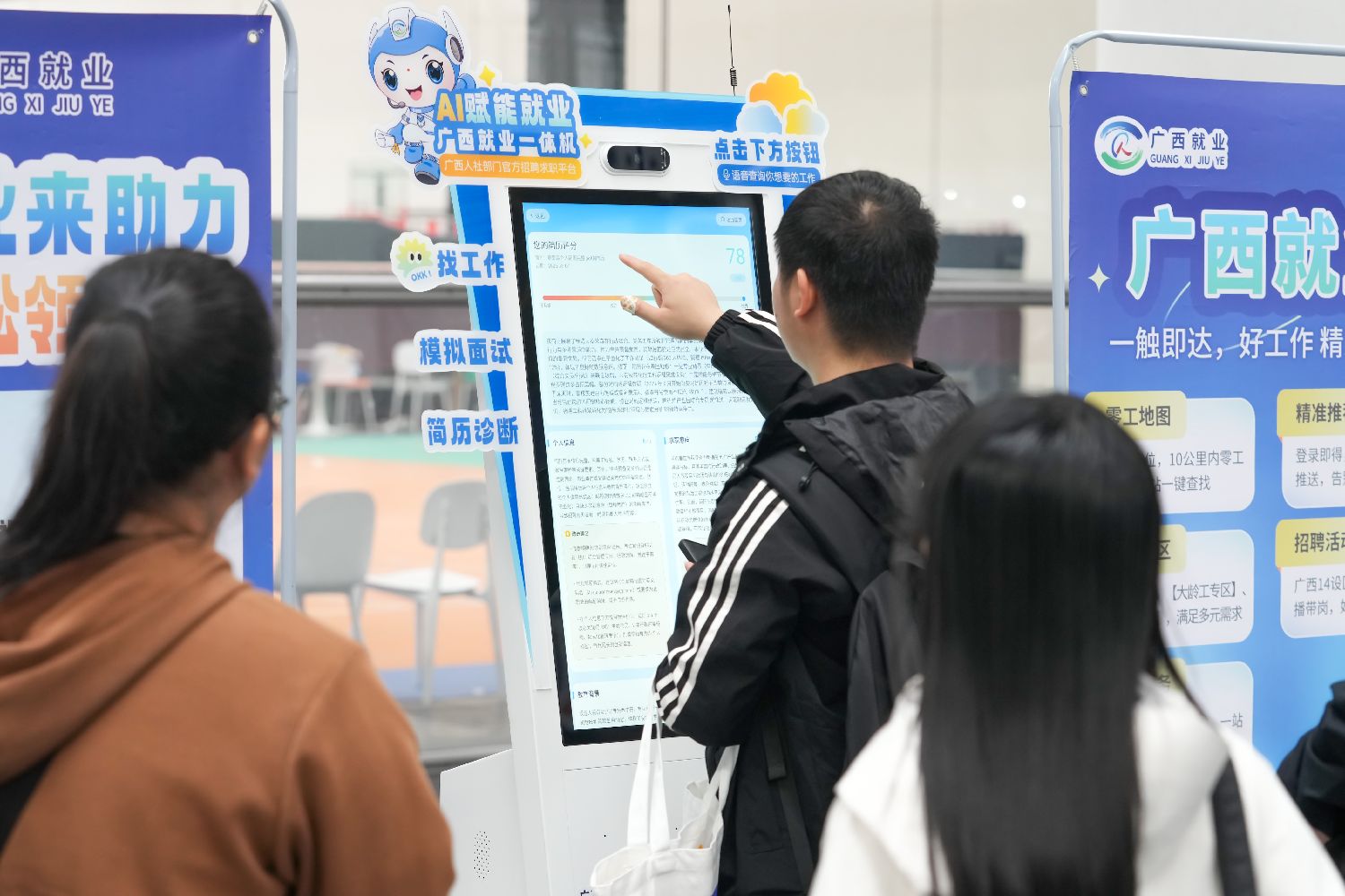 图为3月7日,广西南宁,2026年春季全区人才交流大会在广西南宁国际会展中心举行,求职者通过人工智能设备进行简历诊断。(中新社)