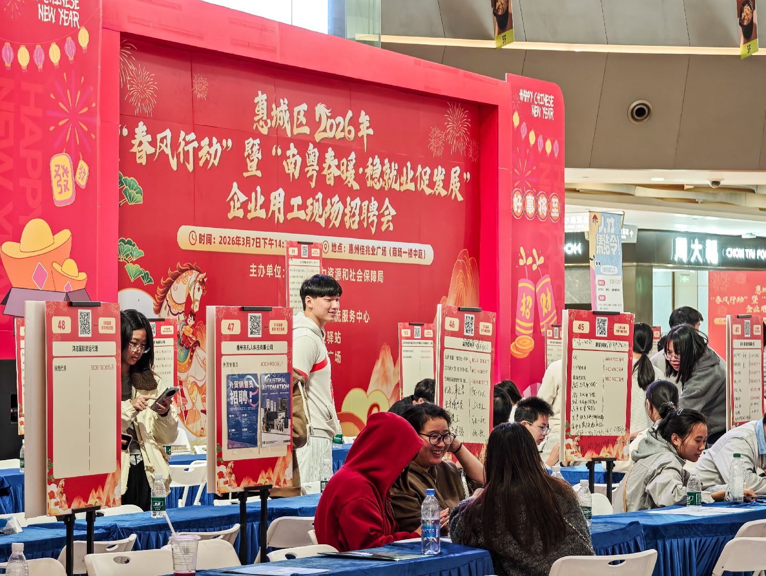 图为3月7日,广东惠州,惠城区2026年“春风行动”暨“南粤春暖稳就业促发展”企业用工现场招聘会在惠州佳兆业广场举办。(CFP)