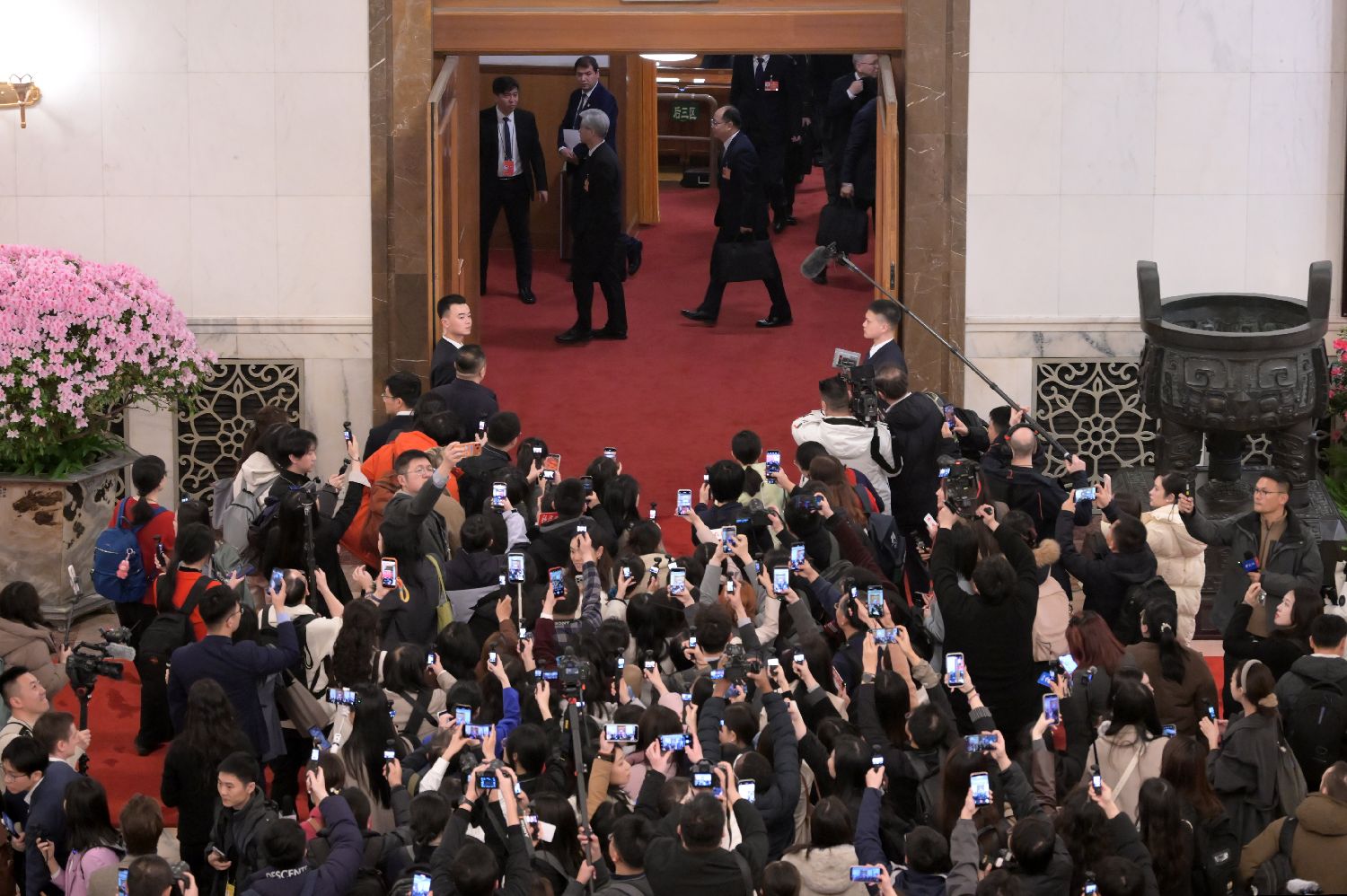3月5日,十四届全国人大四次会议开幕会在北京人民大会堂举行。图为会议结束,媒体记者聚焦参会代表。(图/中新社)