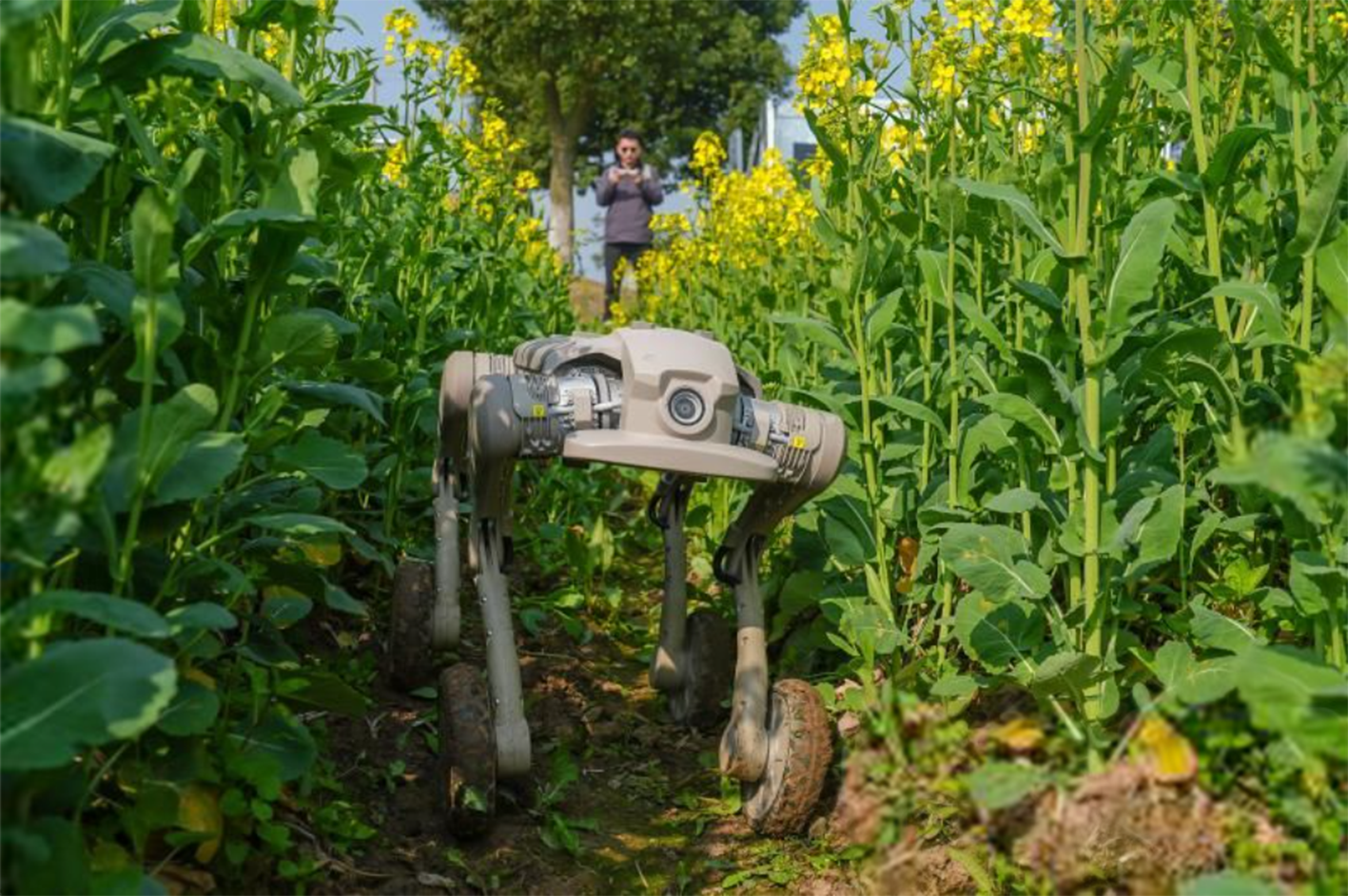 3月10日,在安徽省铜陵市普农集团举行的安徽省2026年早春油菜病虫害绿色防控技术田间培训现场,搭载了高清摄像头和农业AI引擎的巡田机器狗在油菜田里巡查。(中新社)