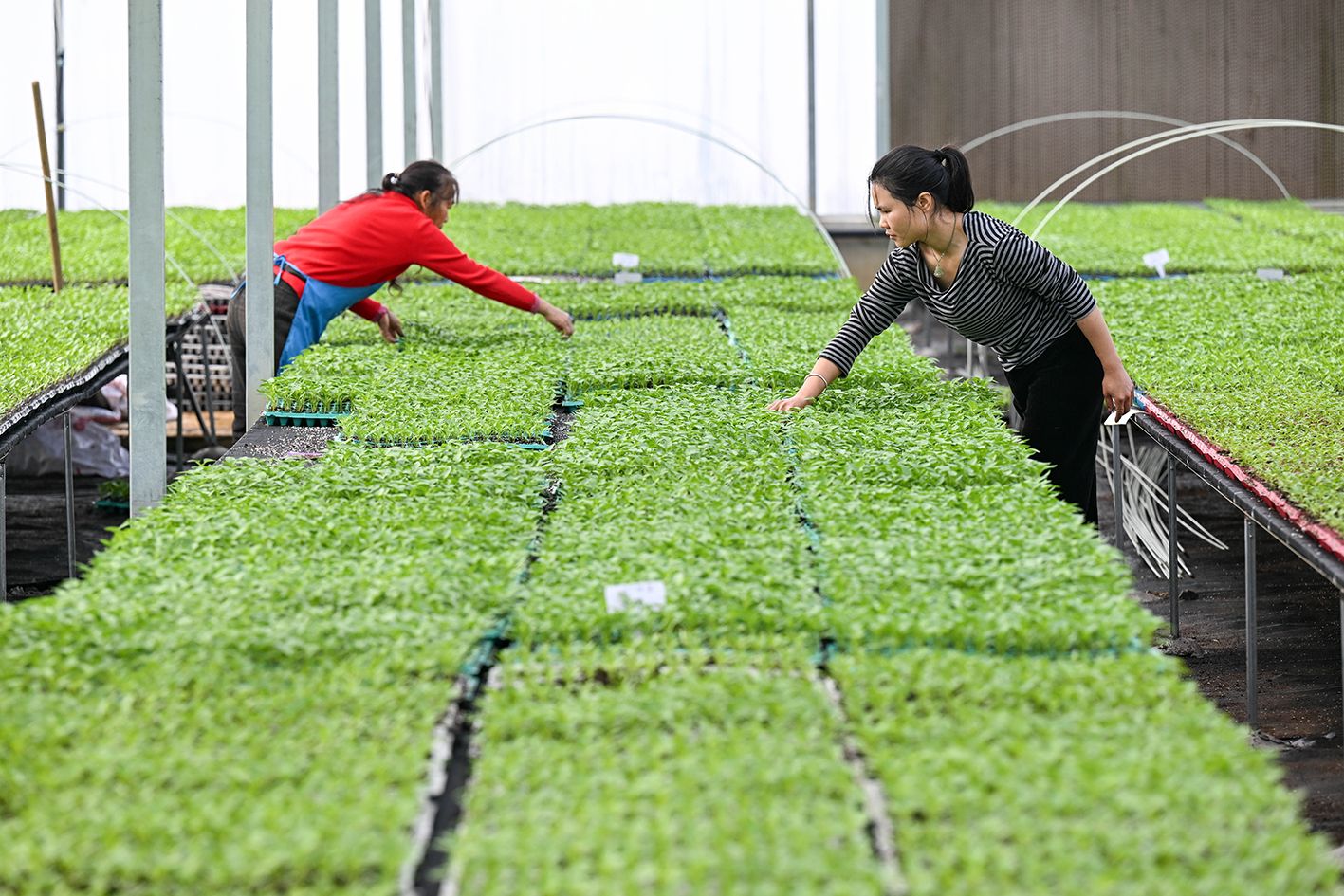 3月10日,工人在贵州省黔南州独山县麻万镇花园村育苗基地摆放蔬菜苗盘。据悉,该育苗基地依托成熟的培育管理模式,根据市场订单和农户需求开展辣椒、茄类、瓜类等蔬菜种苗培育。截至目前,该基地育苗规模达15000余盘,可满足800余亩蔬菜种植需求。(中新社)