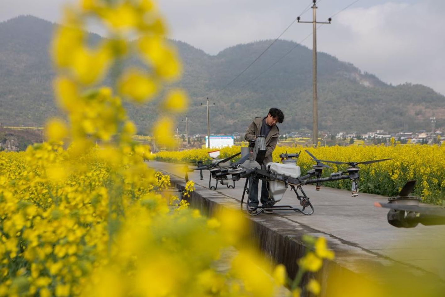 3月10日,在重庆市秀山土家族苗族自治县清溪场街道油菜种植基地,种植大户在给无人机安装电池,准备开展“一喷多促”田管作业。(新华社)
