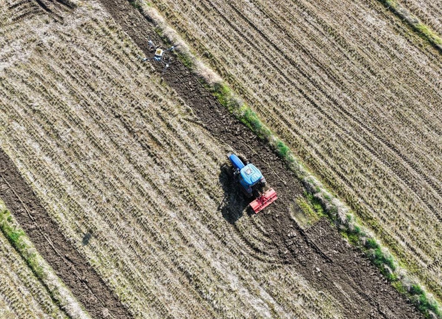 3月11日,在浙江省金华市金东区曹宅镇莲塘潘村的农田里,旋耕机与农用无人机配合,进行翻耕和施肥(无人机照片)。(新华社)