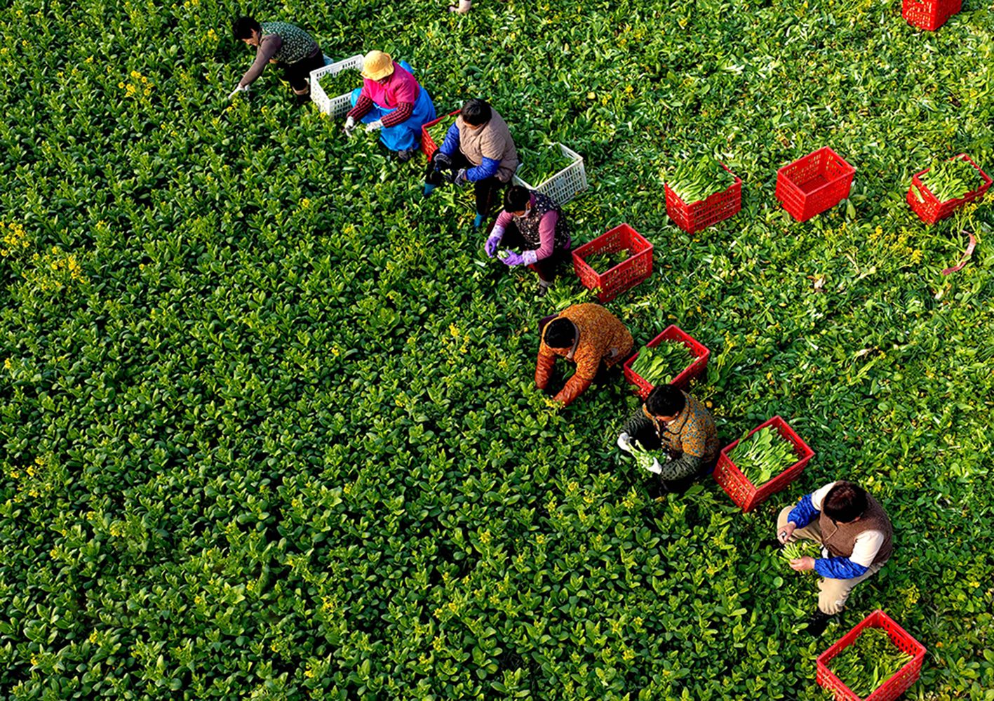 3月9日,在安徽省亳州市利辛县汝集镇刘店村蔬菜种植基地,农民在采收菜薹。(人民网)