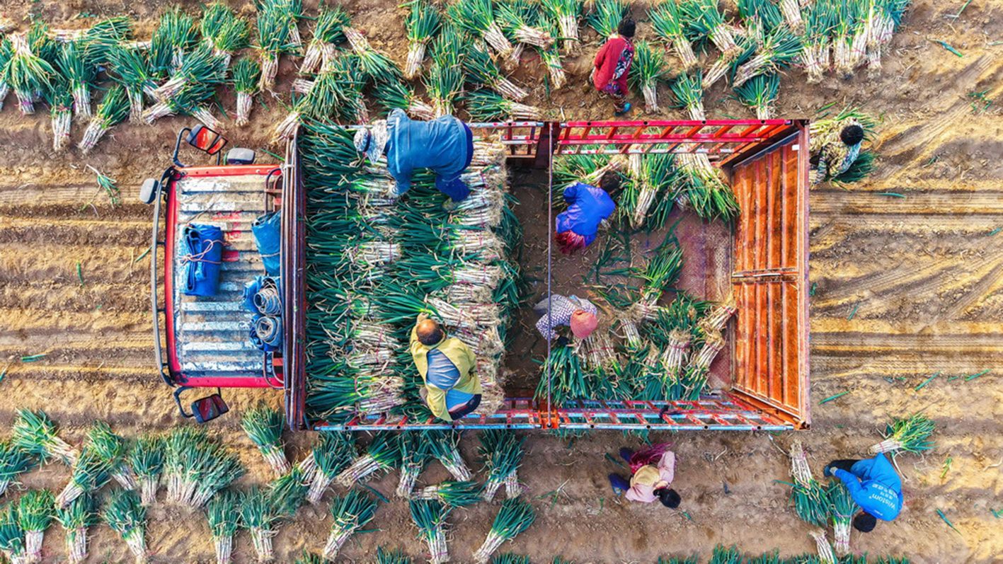 3月10日,河南省南阳市新野县沙堰镇翟庄村,葱农正在田间收获、整理、装车、运送钢葱,田间地头一派忙碌景象。(人民网)