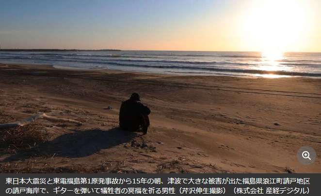 图为在福岛县浪江町请户地区请户海岸边弹奏吉他悼念逝者的男子。(图/《产经新闻》报道截图)