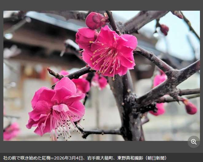 图为三陆御社地天满宫的红梅。(图/《朝日新闻》报道截图)