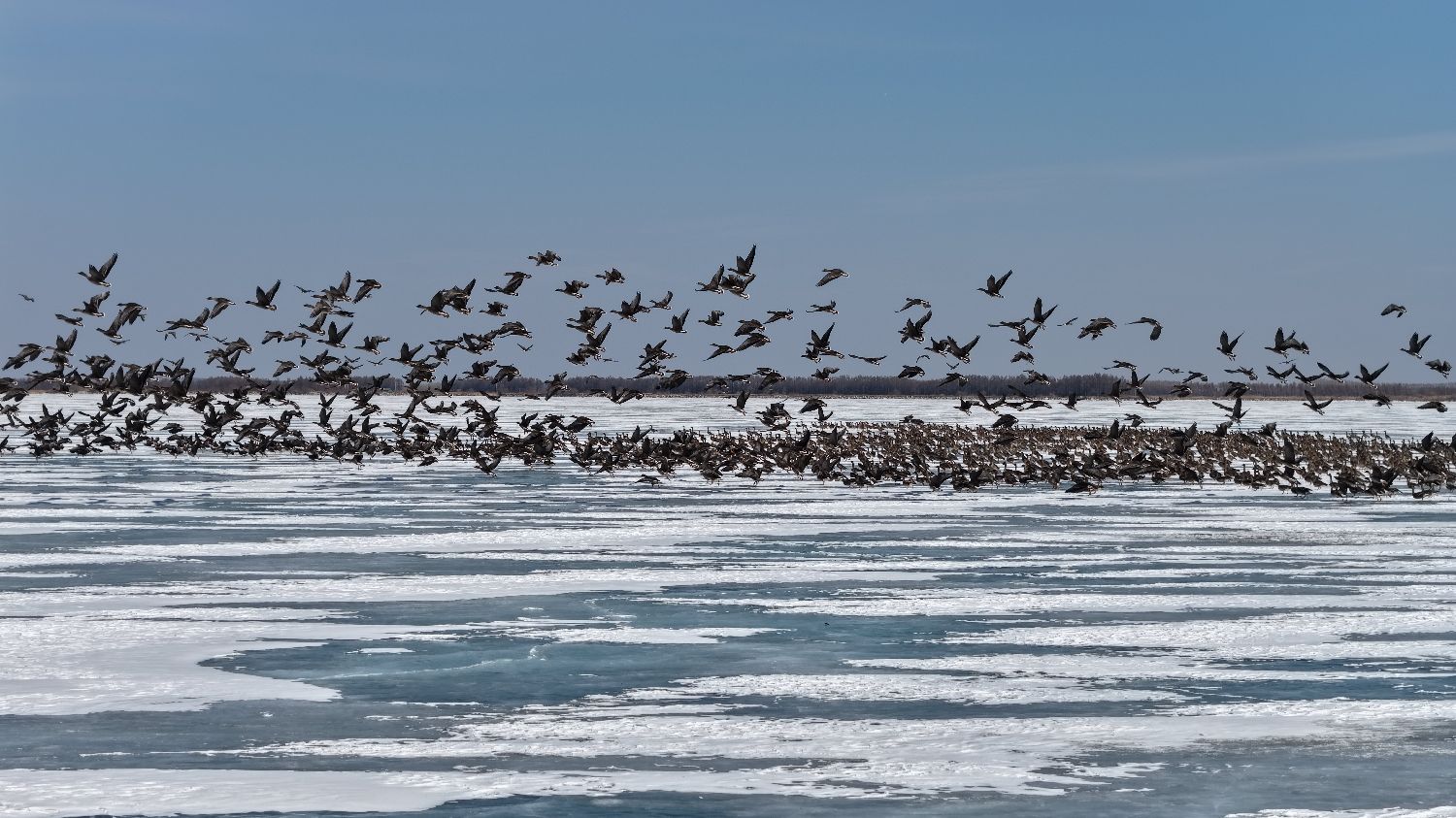 目前,小兴凯湖一带迎来近万只大雁种群集结栖息,它们或低空盘旋、或在冰面栖息觅食,场面十分壮观。与此同时,大兴凯湖第一泄洪闸附近,少数花脸鸭、绿头鸭也已抵达,在开化的小块水面上自在觅食。