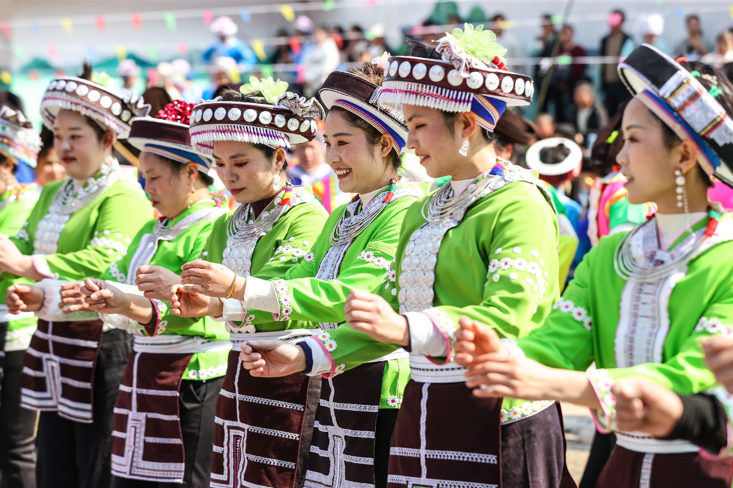 2月21日,贵州省龙里县湾滩河镇果里村举行一年一度的“跳洞”活动。图为苗族民众穿着节日盛装跳舞。(图/中新社)