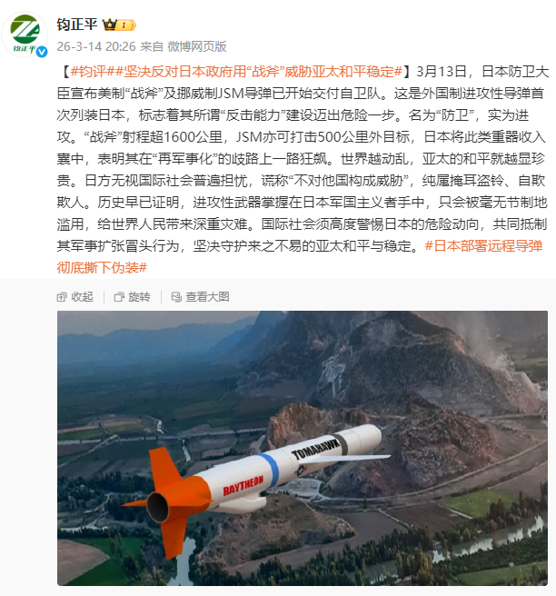 3月13日,日本防卫大臣宣布美制“战斧”及挪威制JSM导弹已开始交付自卫队。这是外国制进攻性导弹首次列装日本,标志着其所谓“反击能力”建设迈出危险一步。名为“防卫”,实为进攻。“战斧”射程超1600公里,JSM亦可打击500公里外目标,日本将此类重器收入囊中,表明其在“再军事化”的歧路上一路狂飙。世界越动乱,亚太的和平就越显珍贵。日方无视国际社会普遍担忧,谎称“不对他国构成威胁”,纯属掩耳盗铃、自欺欺人。历史早已证明,进攻性武器掌握在日本军国主义者手中,只会被毫无节制地滥用,给世界人民带来深重灾难。国际社会须高度警惕日本的危险动向,共同抵制其军事扩张冒头行为,坚决守护来之不易的亚太和平与稳定。