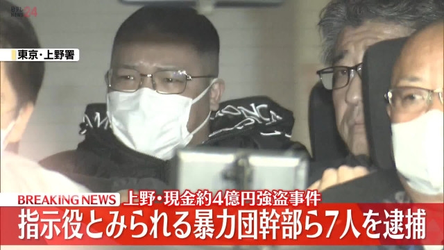 被捕的包括指定暴力团六代目山口组系成员狩野仁琉(21岁)和小池恒儿(47岁)等7人。他们涉嫌于今年1月29日在东京台东区街头,对一群中国籍和日本人组成的团体实施抢劫。当时该团体携带装有约4亿2000万日元现金的3个行李箱,嫌疑人在试图抢走现金逃跑时,向一名男子喷射了类似催泪喷雾的物质,因此被以抢劫嫌疑逮捕。此前调查显示,其中5名嫌疑人在案发约1个半小时前,曾在东京板桥区一处公园附近集合,并乘坐一辆白色厢型车前往台东区案发现场附近。随后,在案发约1小时前,疑似由小池嫌疑人驾驶的一辆蓝色轻型汽车在现场附近来回行驶的画面被附近的监控摄像头拍下。案发后,实施抢劫的3人乘坐这辆轻型汽车逃离现场,随后又换乘由狩野嫌疑人驾驶的最初那辆厢型车继续逃走。