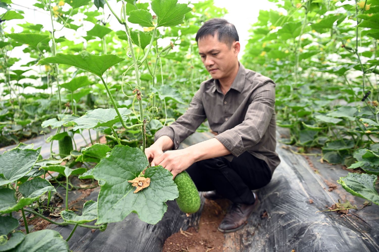 3月14日,刘川在基地查看瓜类蔬菜的长势。(图/中新社)