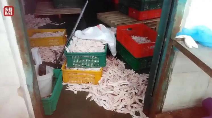 今年3月初,中国国家市场监督管理总局的执法人员查获食品添加剂过氧化氢27桶。图为执法现场发现多桶正在(非法)浸泡的鸡爪。(图/中国央视新闻)