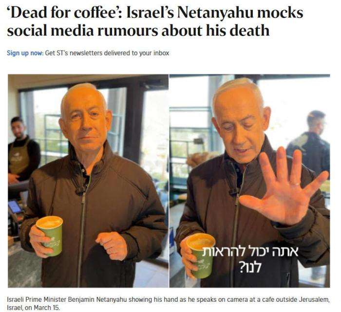 以色列总理内塔尼亚胡15日在社交媒体上发布了一段视频,证明其本人仍健在。(图/新加坡《海峡时报》报道截图)
