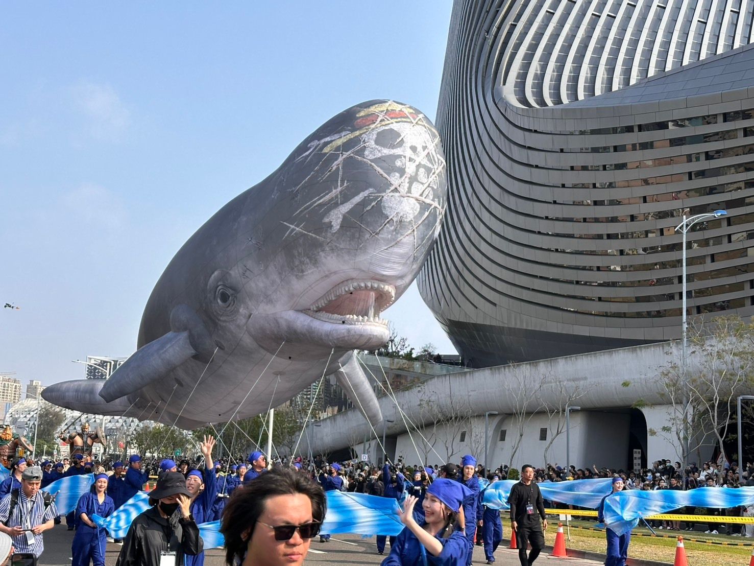 巨型“鲸鱼拉布”现身游行队伍吸引众人目光。(中央社)