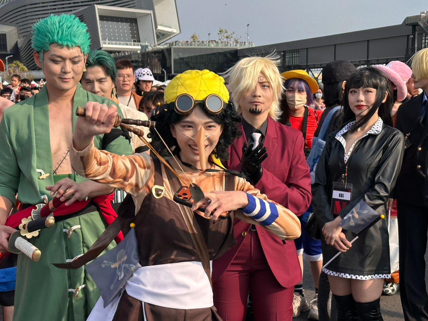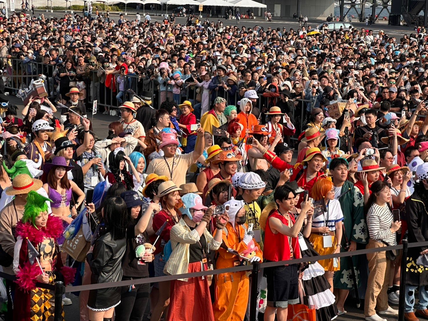 粉丝们化身路飞、罗等经典角色合影留念,现场宛如真人版“伟大航道”。(中央社)