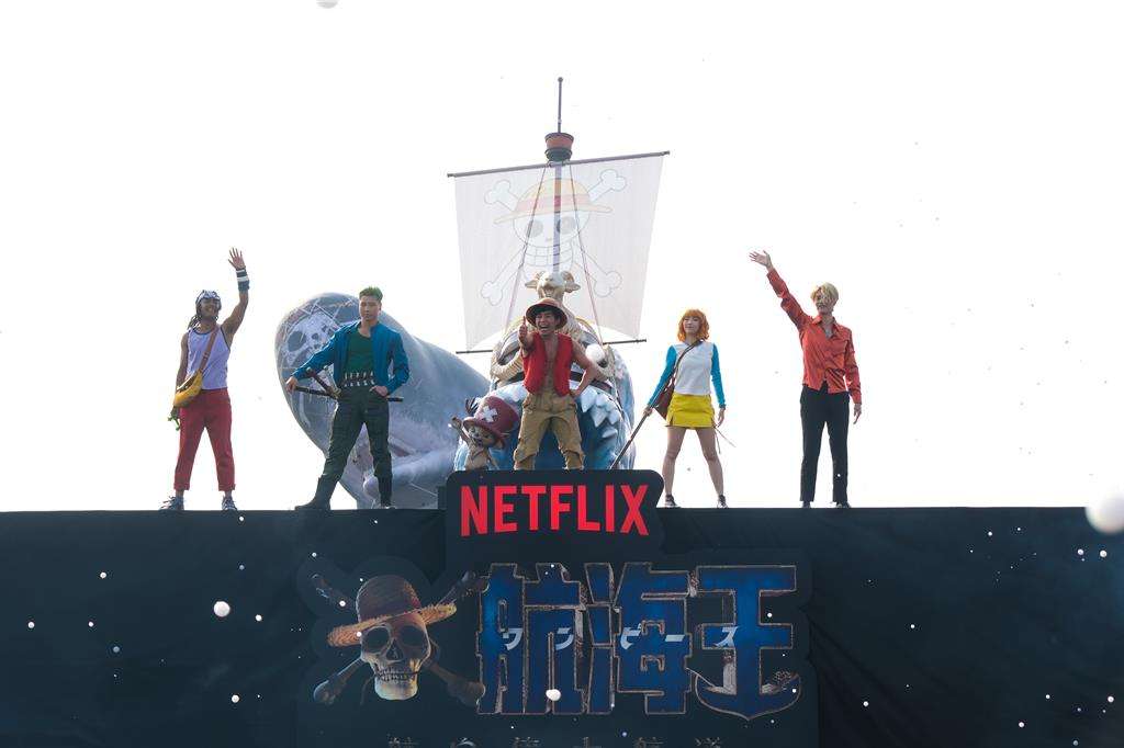 草帽海贼团路飞、索隆、娜美等真人扮演者登上舞台,在Netflix与《航海王》的背景板前向观众挥手致意。(台北中时新闻网)