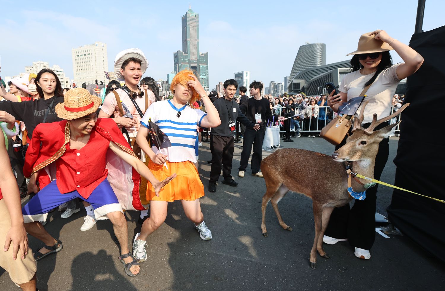 路飞与娜美cosplay与小鹿惊喜同框,上演现实版 “航海奇遇”。(香港中通社)