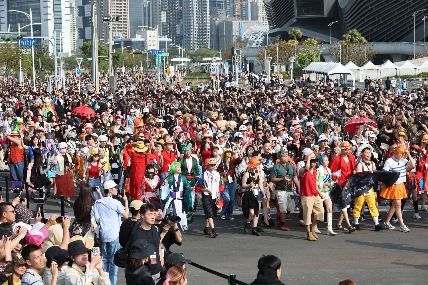 众多粉丝们举着手机拍摄,各色cosplay造型在人群中格外亮眼,将游行氛围推向高潮。(中央社)