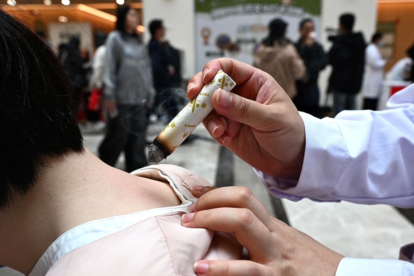 3月15日,福州市中医院五四北院区举行开诊周年庆活动,民众在沉浸式体验中医药活动了解中医药知识,感受中医药文化魅力。图为市民体验艾灸。(中新社)