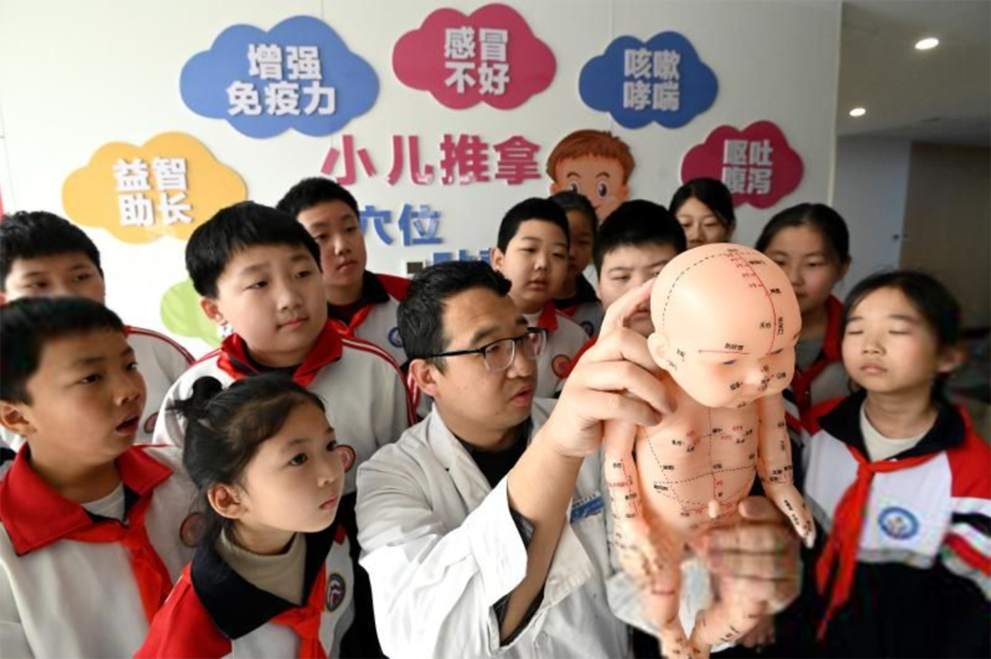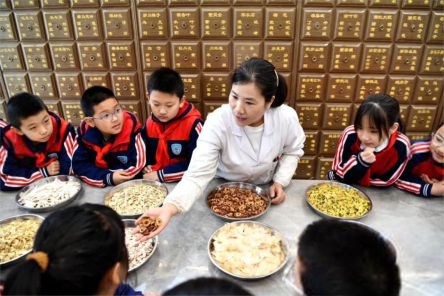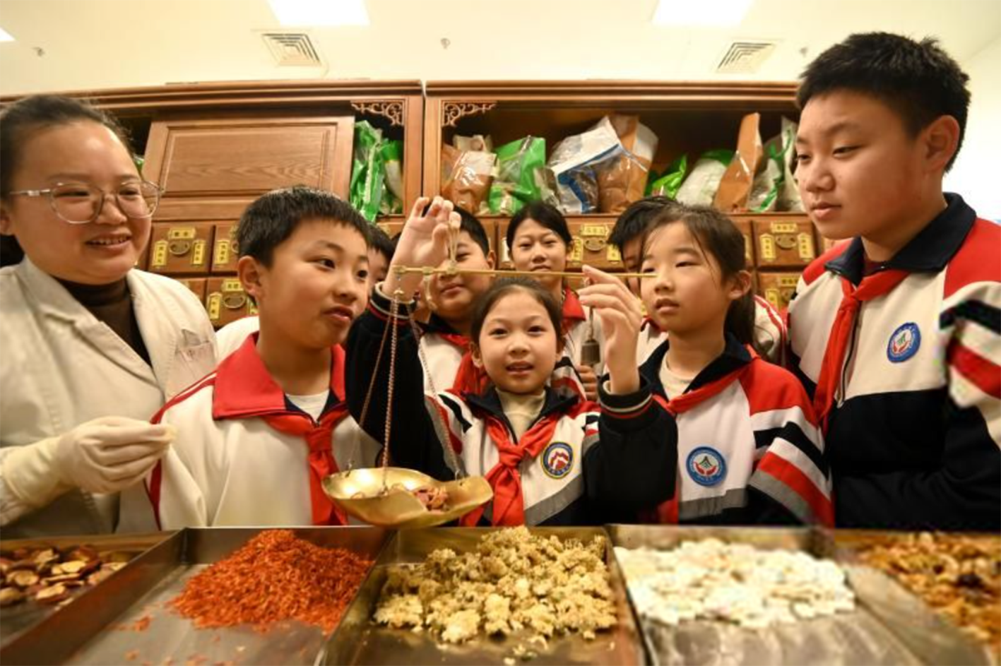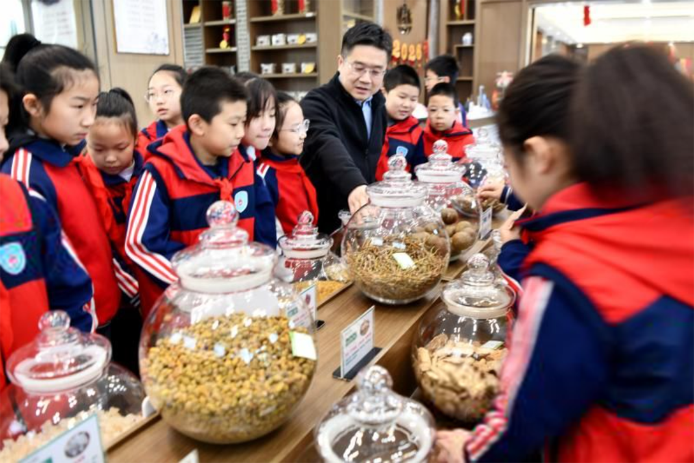 3月16日,河北石家庄,中医堂工作人员正为学生们讲解中医药知识。中国国医节到来前夕,栾城区凌空桥路小学组织学生走进中医堂,开展“学习中医知识 感受国医魅力”主题实践活动,让学生们感受中医药文化的独特魅力,增强对中华优秀传统文化的认同感和传承意识。(中新社)
