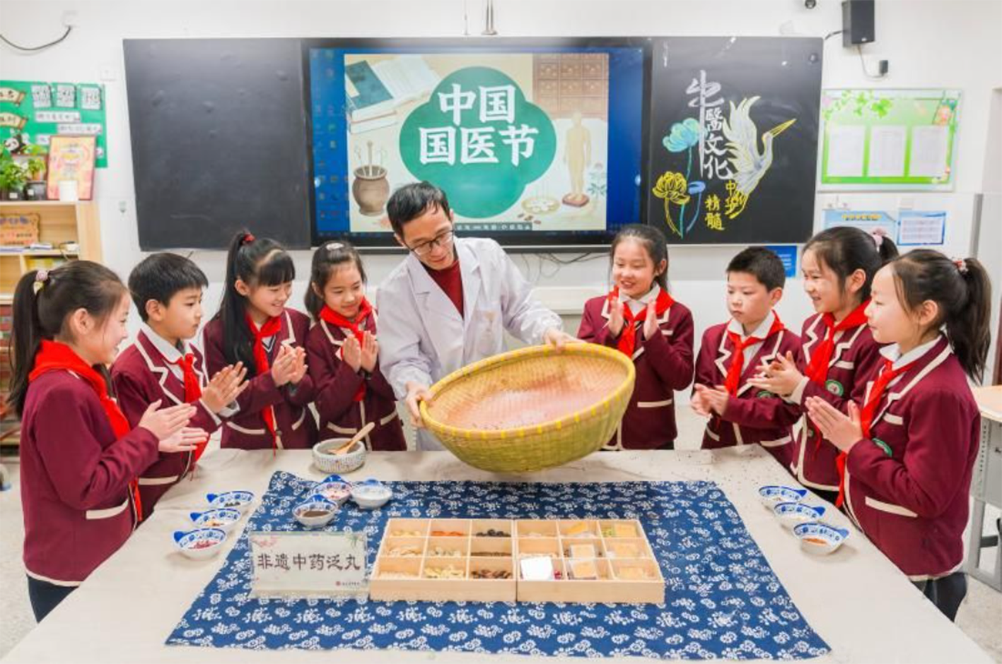 3月16日,江苏省海安经济开发区实验小学开展“中医药知识进校园”主题活动。学生们在海安市中医院中药师的指导下识别中药材,制作中药药丸,感受中医魅力,弘扬传统中医药文化,迎接3月17日“中国国医节”。(中新社)