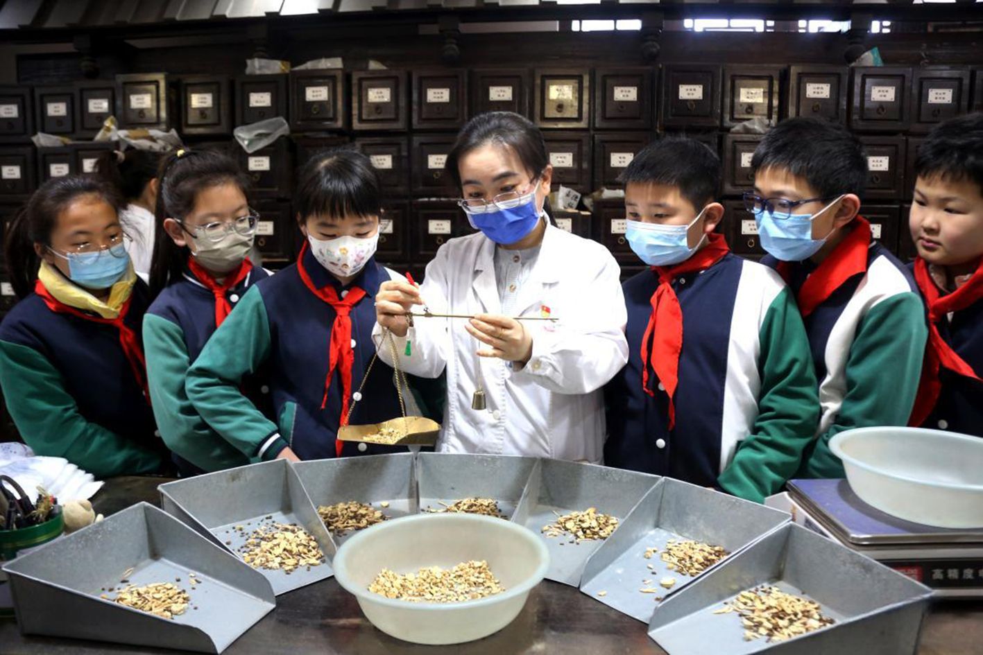 3月17日,在江苏省连云港市连云区一中医馆,医务人员为学生讲解称量中草药。当日是"中国国医节",江苏省连云港市院前小学在中医馆开展传承国粹守护健康主题实践活动,学生们识别中药材,了解中医疗治知识,体验中医文化,感受中医药魅力。(北京光明网)