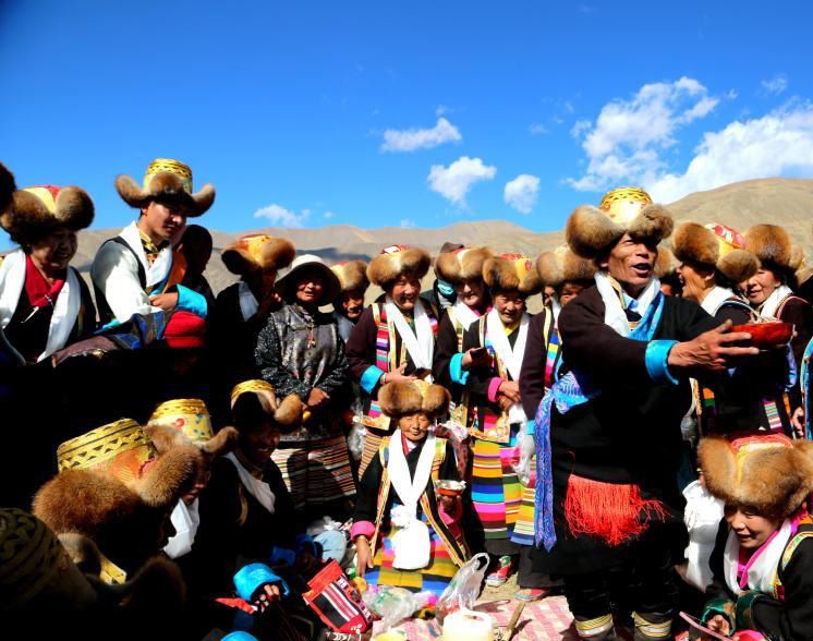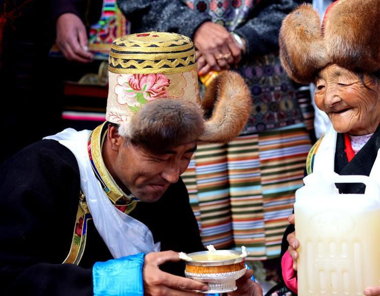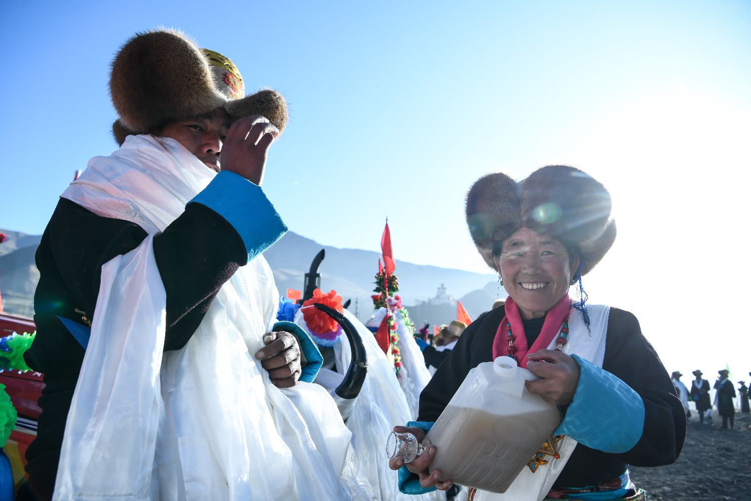 3月16日,西藏山南市乃东区门中岗社区村民在春耕仪式上互敬青稞酒。(中新社)