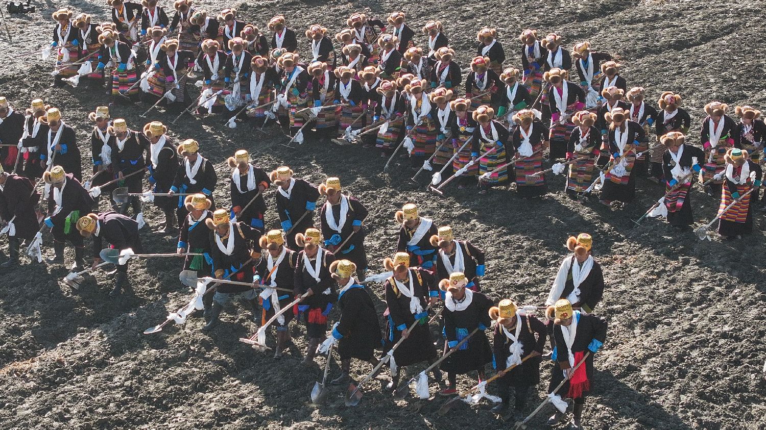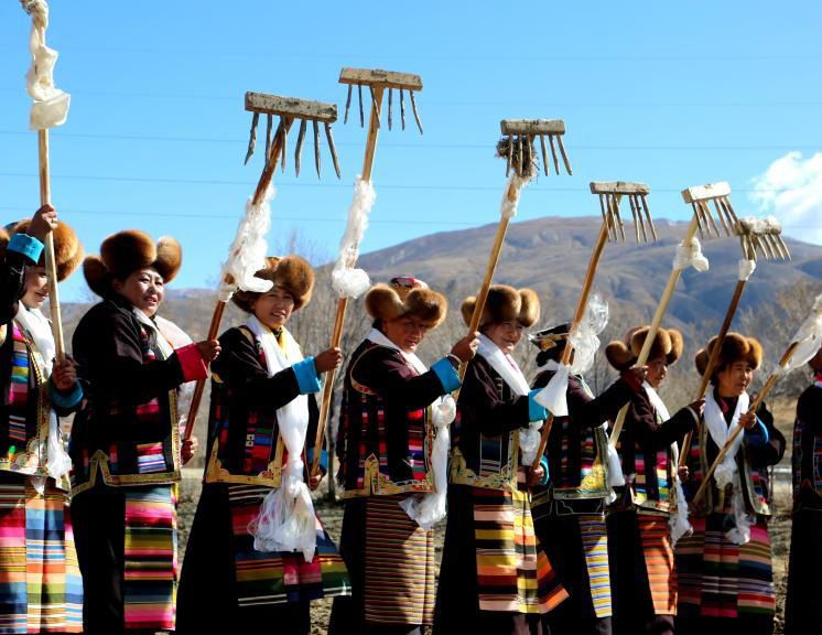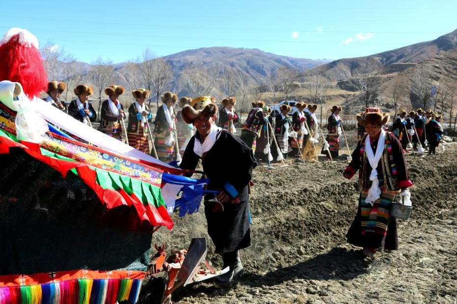 3月16日,西藏山南市琼结县琼结镇白日社区妇女们正在准备翻耕。(中新网)