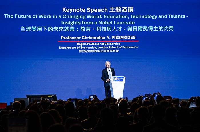 3月18日,2010年诺贝尔经济学奖得主、伦敦政治经济学院经济学教授克里斯托弗·皮萨里德斯(Christopher Pissarides)在香港出席“国际人才论坛”,作“全球变局下的未来就业:教育、科技与人才”主题演讲。图为皮萨里德斯分享见解。(图/中新社)