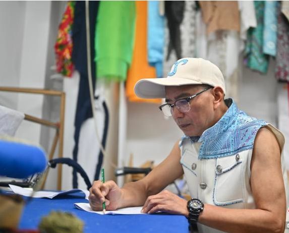 图为扬江诚为新款壮锦服饰绘制设计稿。(图/中新网)