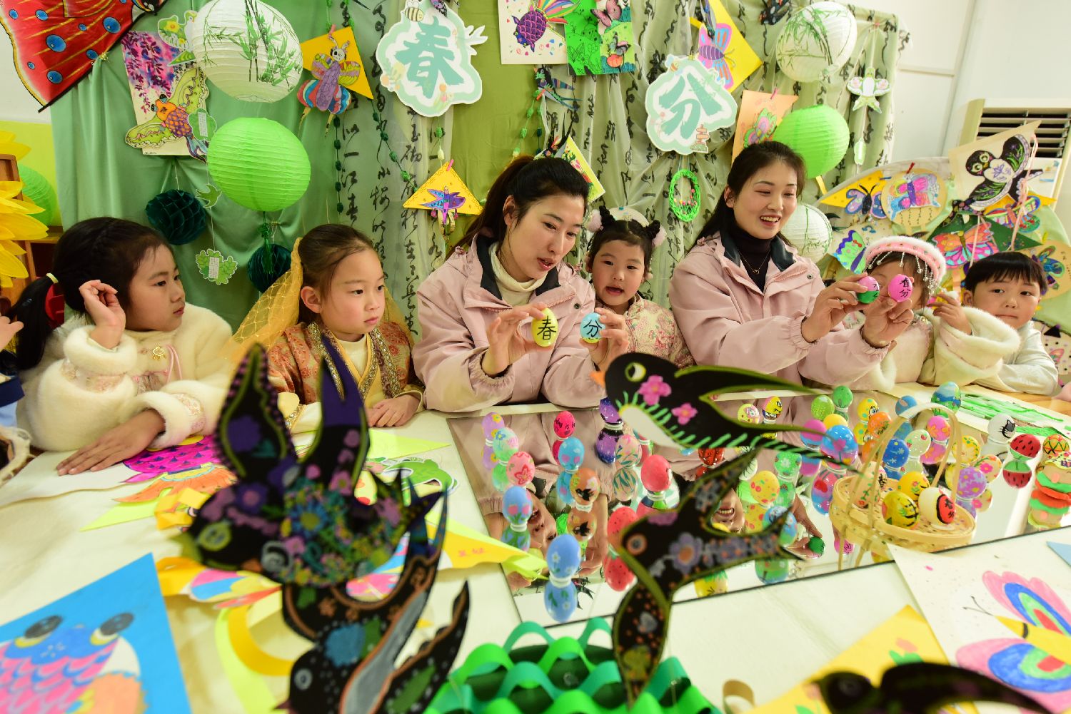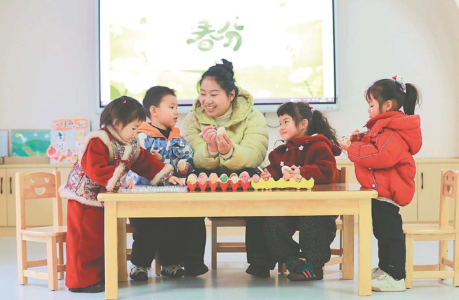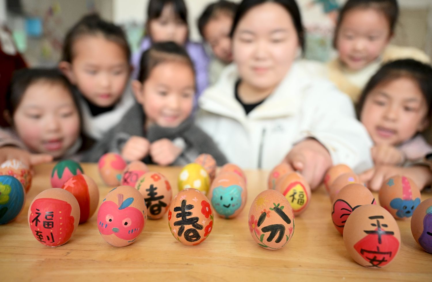 在安徽省阜阳市颍东区幸福路幼儿园,老师教孩子们描绘春分“彩蛋”,了解春分节气知识,感受传统习俗文化。(人民网)