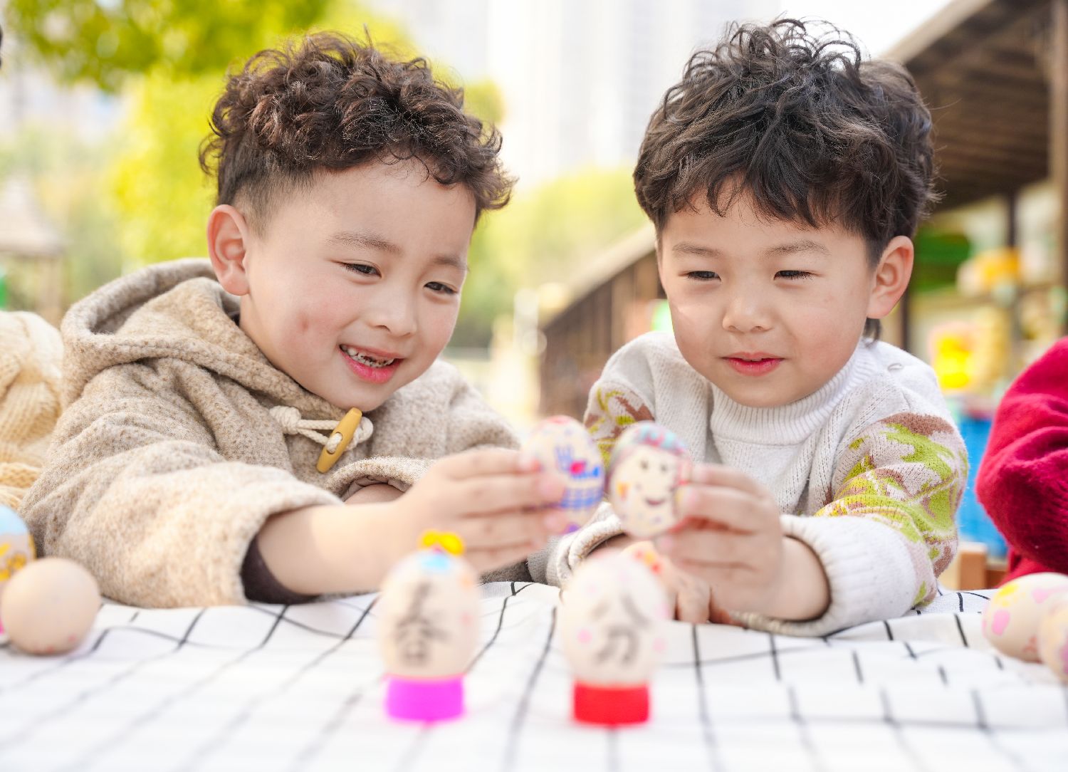 3月20日,在河北省石家庄市栾城区第二幼儿园,小朋友在玩“立蛋”游戏,体验传统民俗。当日是春分节气,石家庄市栾城区第二幼儿园开展“学习俗 过春分”多彩民俗活动,小朋友画彩蛋、玩“立蛋”游戏,了解春分习俗,共同感受传统文化的魅力。(中新社)