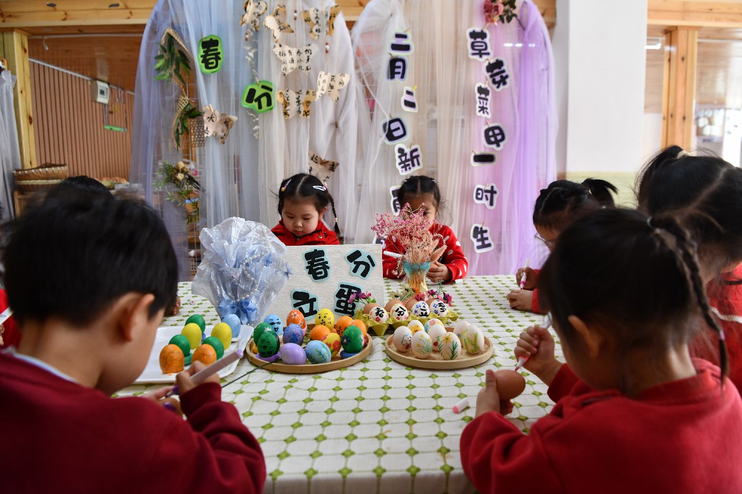 3月20日,浙江省湖州市长兴县回龙山幼儿园开展了“绘彩蛋、立彩蛋、迎春分”趣味传统主题民俗教育活动,引导小朋友了解春分习俗,感受传统文化。(中新社)