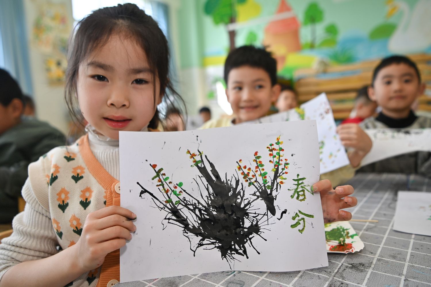 3月19日,在山东省潍坊青州市宏远学校附属幼儿园,小朋友展示绘制的春分绘画。(CFP)
