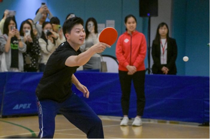 3月20日,“体育的华丽蜕变:再创高峰”论坛在香港理工大学举行,中国乒乓球运动员马龙、中国香港体育协会暨奥林匹克委员会副会长霍启刚以及多位香港运动员出席活动,与香港青年学生进行交流。图为马龙现场进行乒乓球互动交流。(图/中新社)