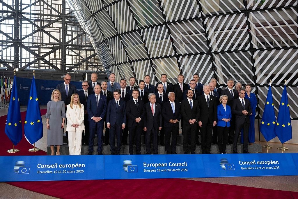 3月19日,比利时布鲁塞尔,欧盟领导人在欧盟总部举行的欧盟峰会期间合影。(视觉中国)