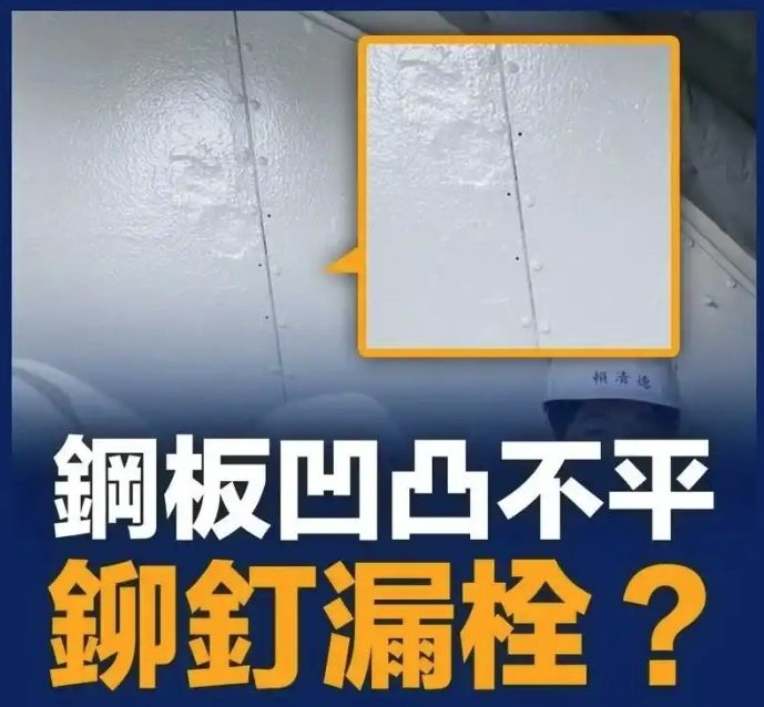 马文君指出,官方公布的影像中,有一张赖清德与一众官员舰内合影照,图片中赖清德背后的钢板明显凹凸不平,还有至少三个铆钉处没栓上。