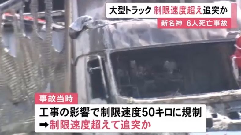 (亚太快讯消息)日本三重县龟山市新名神高速公路20日凌晨发生一起重大交通事故,一辆大型卡车在隧道内追尾前方车队,造成包括3名儿童在内的6人死亡。最新调查显示,涉事卡车事发时疑似超过限速行驶。