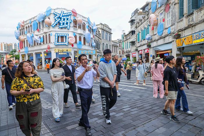 3月20日,台湾青年参访海口骑楼老街,感受海口城市发展与文化传承的融合之美。(图/中新社)