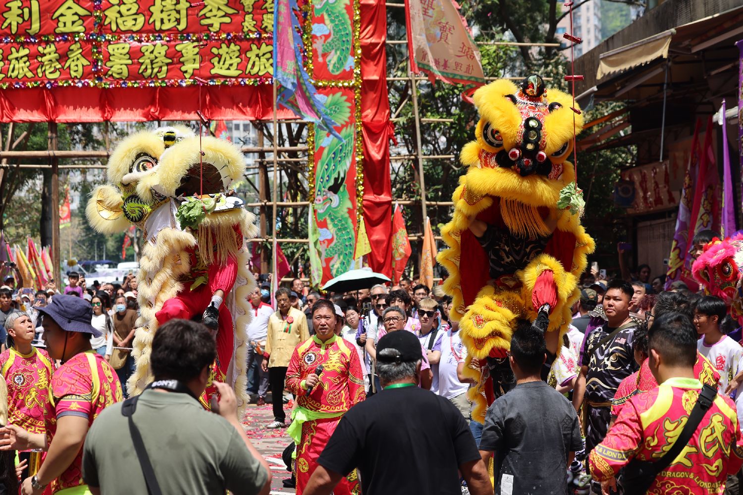 3月22日,逾百年历史、位列香港非物质文化遗产的鸭脷洲洪圣传统文化节热闹启幕。活动以龙舟拜庙、醒狮采青、贺诞巡游等经典民俗环节再现传统韵味,并首度向公众开放海上祈福放水灯仪式,万人空巷共庆非遗盛事,让百年民俗在传承中焕发崭新活力。该民俗活动已于2014年被列入首份《香港非物质文化遗产清单》。图为“贺诞巡游”的醒狮与民众互动。(中新社)