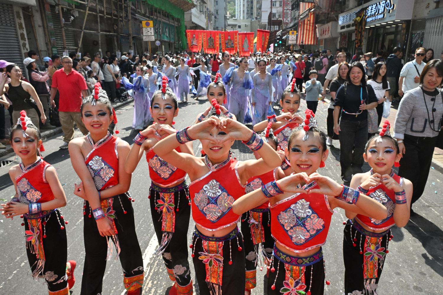 3月22日,“贺诞巡游”的表演队伍摆出心形手势合影。(中新社)