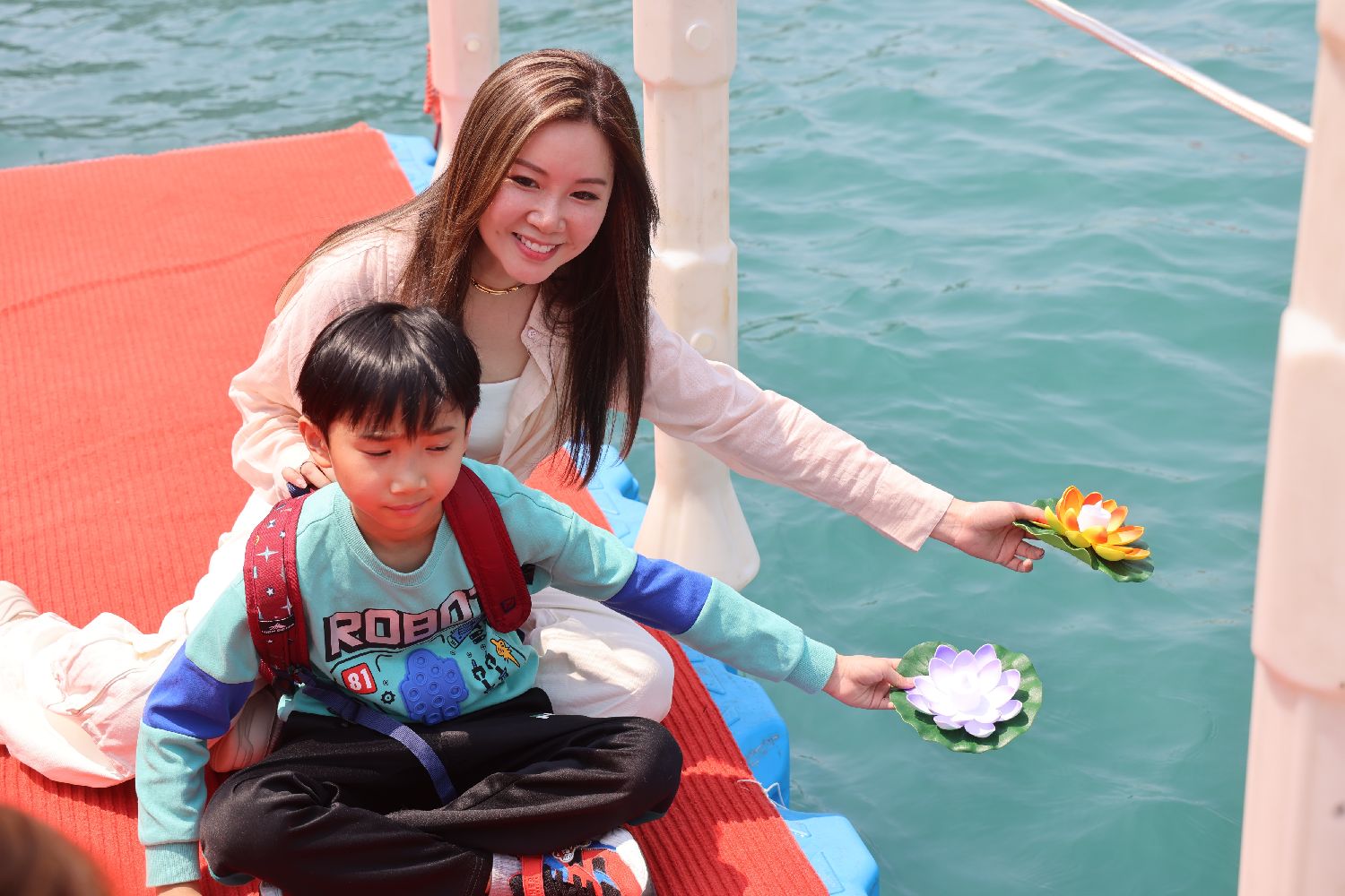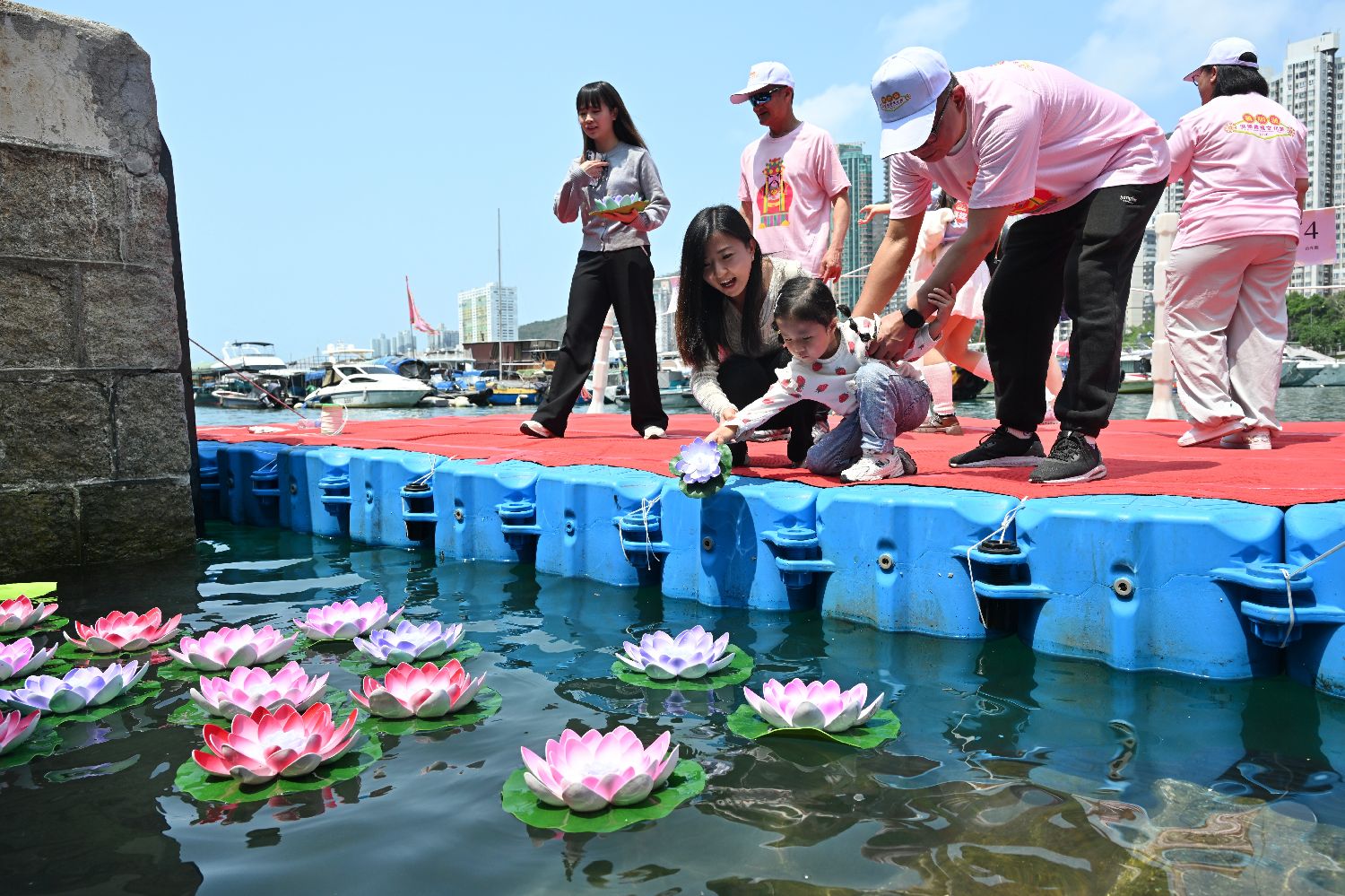 3月22日,本届活动首次开放公众海上放水灯环节,有市民携孩童到现场参与。(香港中通社)