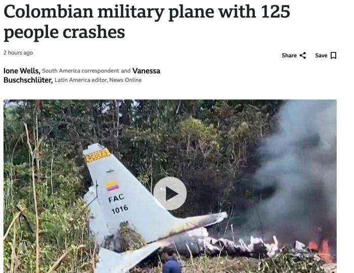 哥伦比亚一载有125人军机坠毁 已有数十人获救