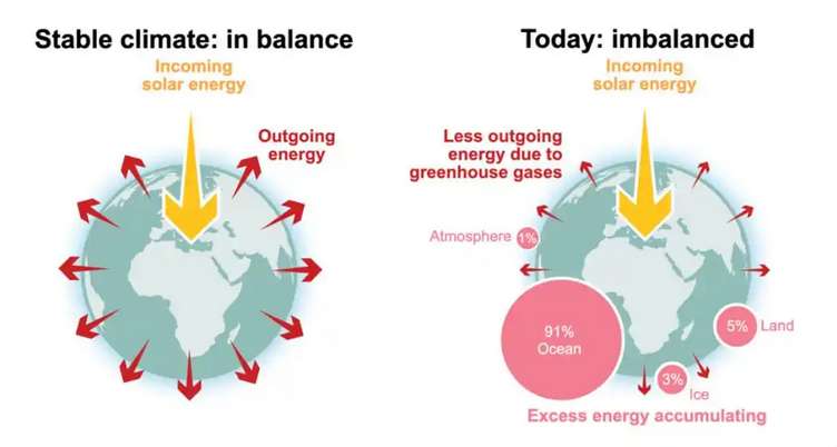 报告指出,留存地球的过剩能量中,仅1%储存在大气层,造成大气层变暖。大约5%的过剩能量储存在大陆陆地中。超过91%的过剩热量储存在海洋中。