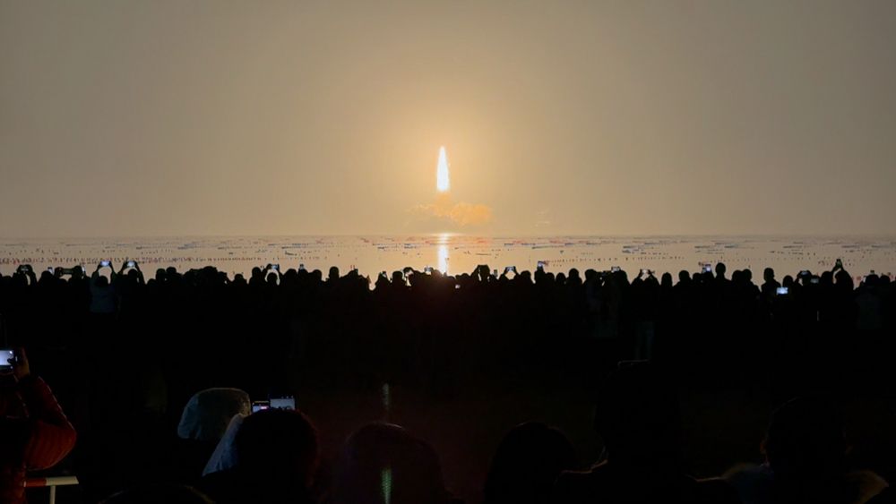 当地时间3月22日深夜,山东海阳连理岛,游客近距离观看海上火箭发射。(图/中新社)